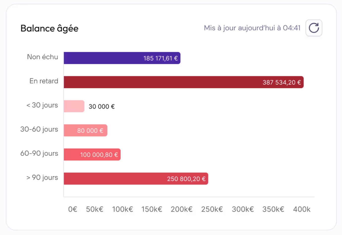 Autre vue incontournable pour Magali et son équipe : la balance âgée. Elle offre une vision synthétique mais surtout actionnable de toutes les factures en retard, en les groupant par ancienneté. Cela permet à l’équipe de hiérarchiser clairement ses priorités et d’agir en fonction de l’urgence et de l’importance des montants.